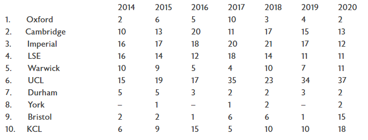 콩코드 컬리지 학생들은 매년 영국의 일류 대학에 입학하고 있다. 특히 영국 의과대학뿐만 아니라 공학, 경제학, 수학 과목에 특화된 학과에 입학시키는 데 강한 기록을 가지고 있다. 그 중에서도 의대 진학은 특히나 경쟁력 있다. 2020년 콩코드컬리지의 학생 중 41명의 학생들이 의대, 치과, 수의대에 입학했다. 또한 2020년 졸업생 중 78%가 현재 영국 상위 10개 대학(90%가 영국 상위 20개 대학)에 재학 중이다. 아래 표는 지난 7년간 영국의 상위 10대 대학에 진학한 결과이다.