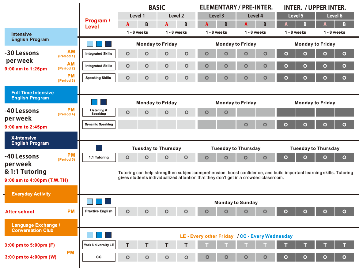 | 3개월 : CAD 4,740 6개월 : CAD 9,000 9개월 : CAD 13,140 | 등록비 CAD 200 교재비 CAD 주당 CAD 15 |