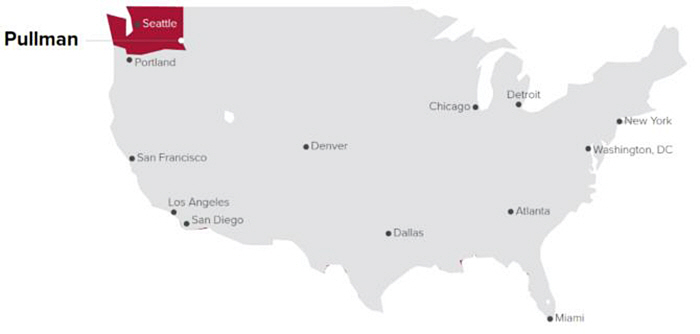 Washington State University (WSU) 워싱턴 주립대는 워싱턴 주 풀먼에 메인 캠퍼스가 위치해 있으며 벤쿠버, 트라이시티, 스포켄, 에버렛 총 5개 캠퍼스가 있는 공립연구 중심 대학교이다. 메인캠퍼스가 위치한 풀먼은 미국에서 가장 안전한 도시 10위에 꾸준이 포함되며, 대학교를 중심으로 도시가 형성된 미국의 전형적인 컬리지 타운이다. 미국 서북부지역의 가장 대표되는 도시인 시애틀과는 비행기로 1시간 거리이며, 시애틀은 스타벅스, 보잉사, 마이크로소프트 그리고 아마존의 본사가 위치한 도시로 유명하다. WSU 졸업생들은 다양한 분야의 OPT 기회를 얻을 수 있다.